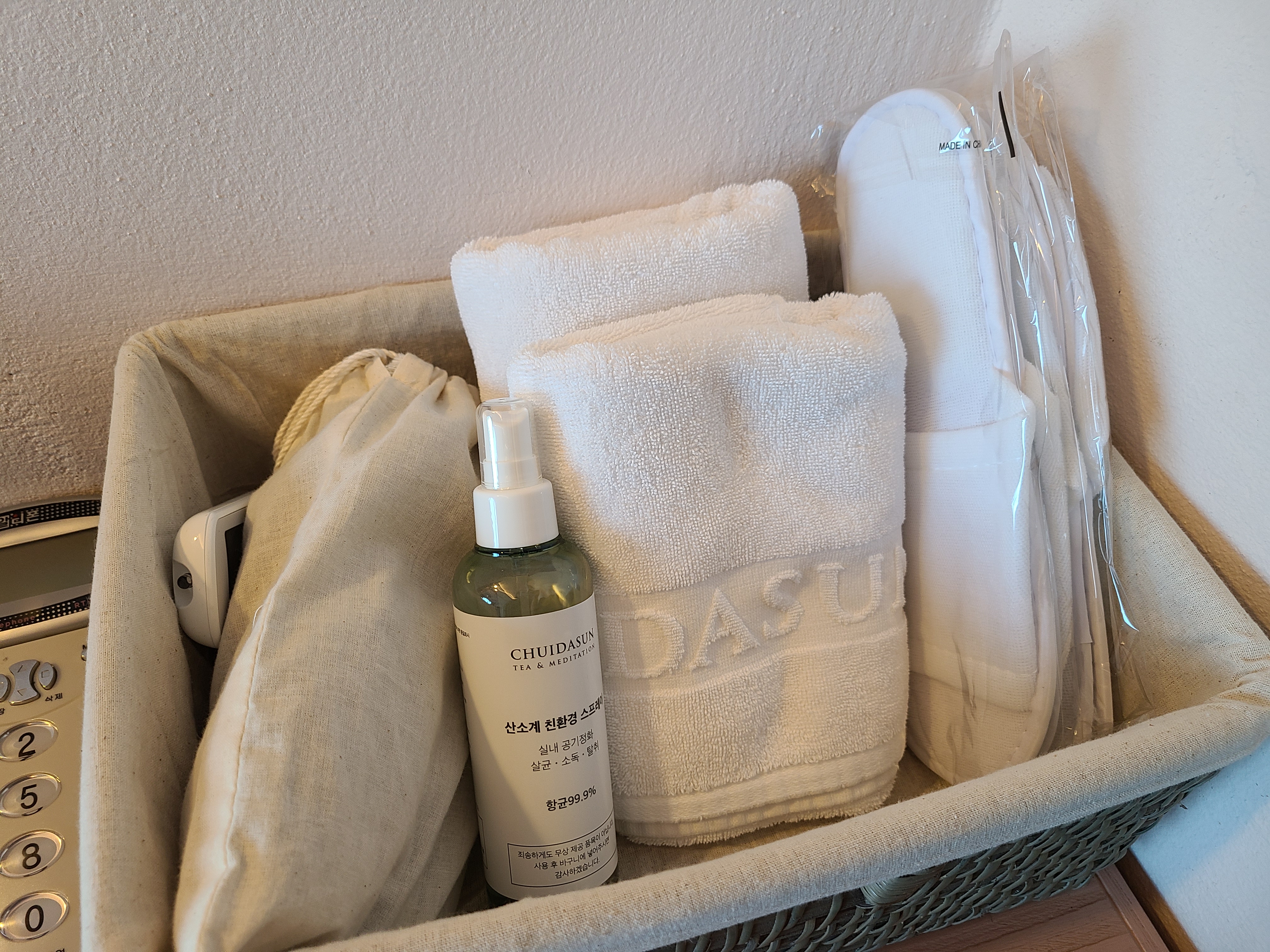 슬리퍼, 여분 수건, 드라이어, 탈취제, 물이 있습니다.