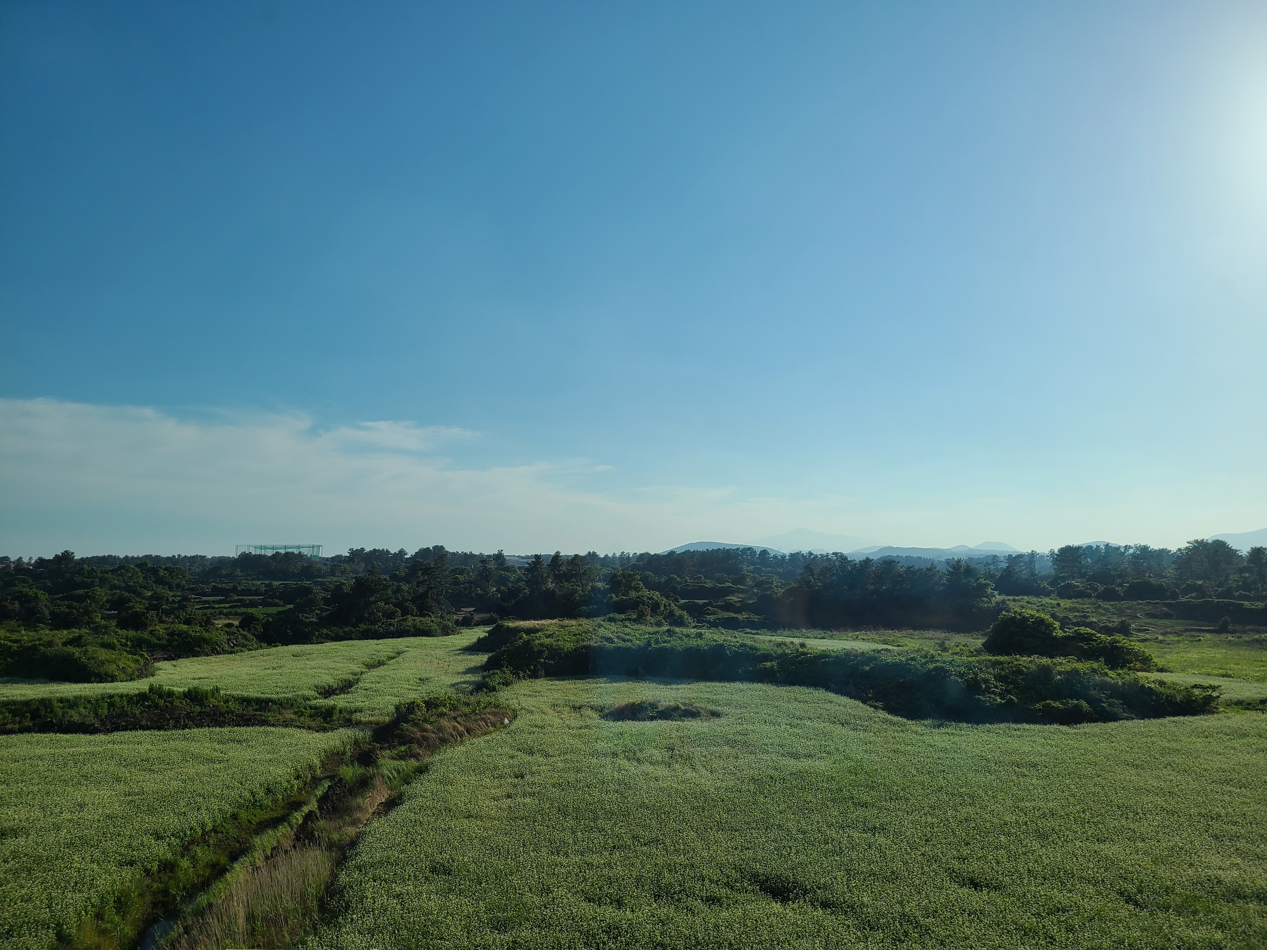 고개를 돌리면 이렇게 푸른 보리밭과 연못이 있어요.