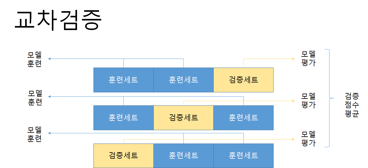 검증 세트에서 따로 한 세트를 떼어내어 여러 과정을 반복하여 모델을 평가하는 과정을 거치는 것이 교차 검증