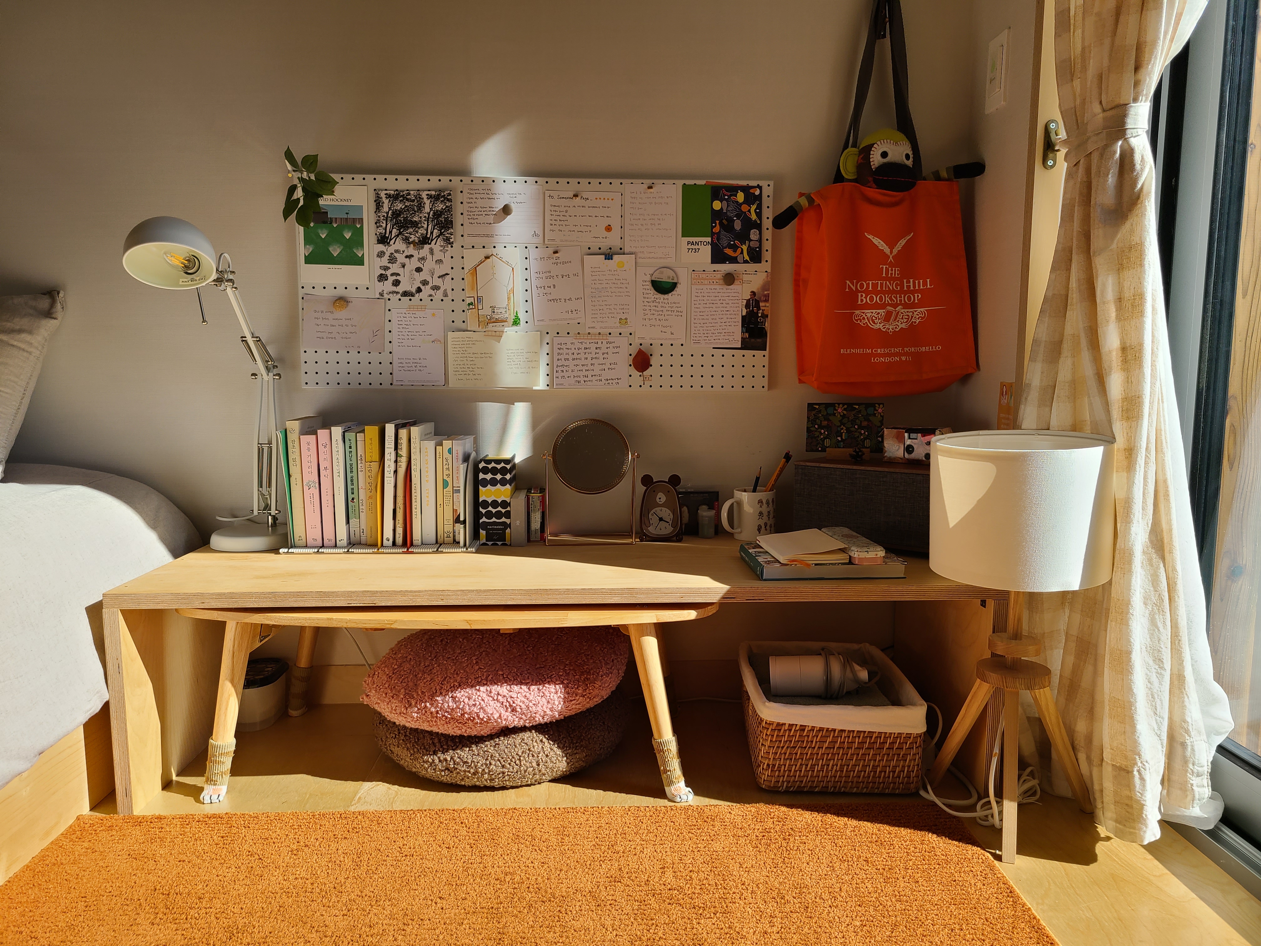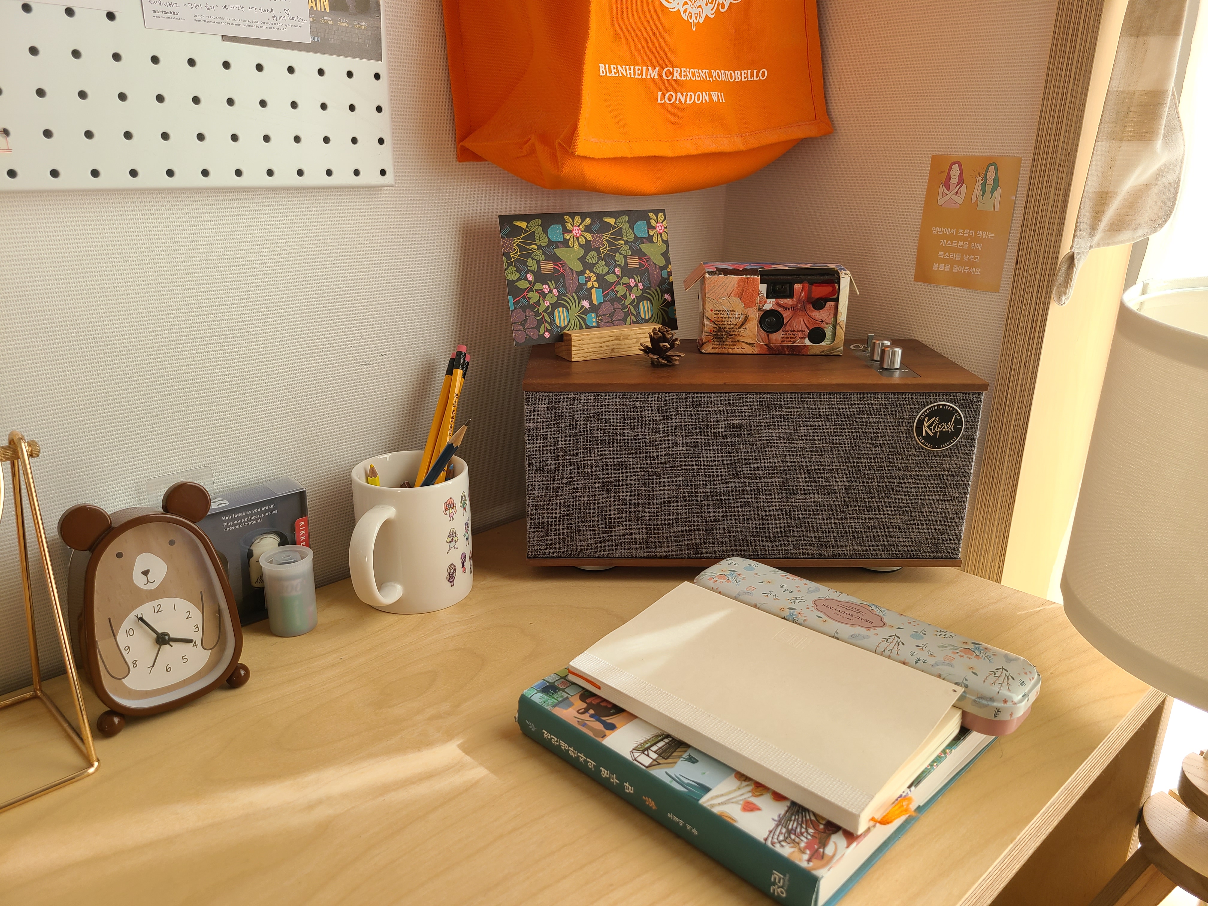 책상에는 아기자기한 소품들과 이곳에서 묵고 간 사람들이 적은 엽서들, 책, 필기구 등이 있었다.