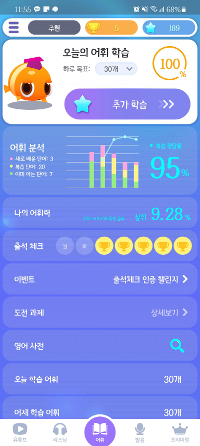 간단하게 어플 소개를 하면 어휘, 리스닝, 유튜브, 발음을 공부 할 수 있다.