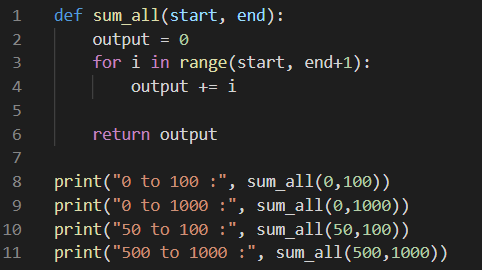 [기본미션] 223쪽 [직접 해보는 손코딩: 범위 내부의 정수를 모두 더하는 함수] 실행 후 코드가 입력된 화면 및 실행결과 화면 인증샷