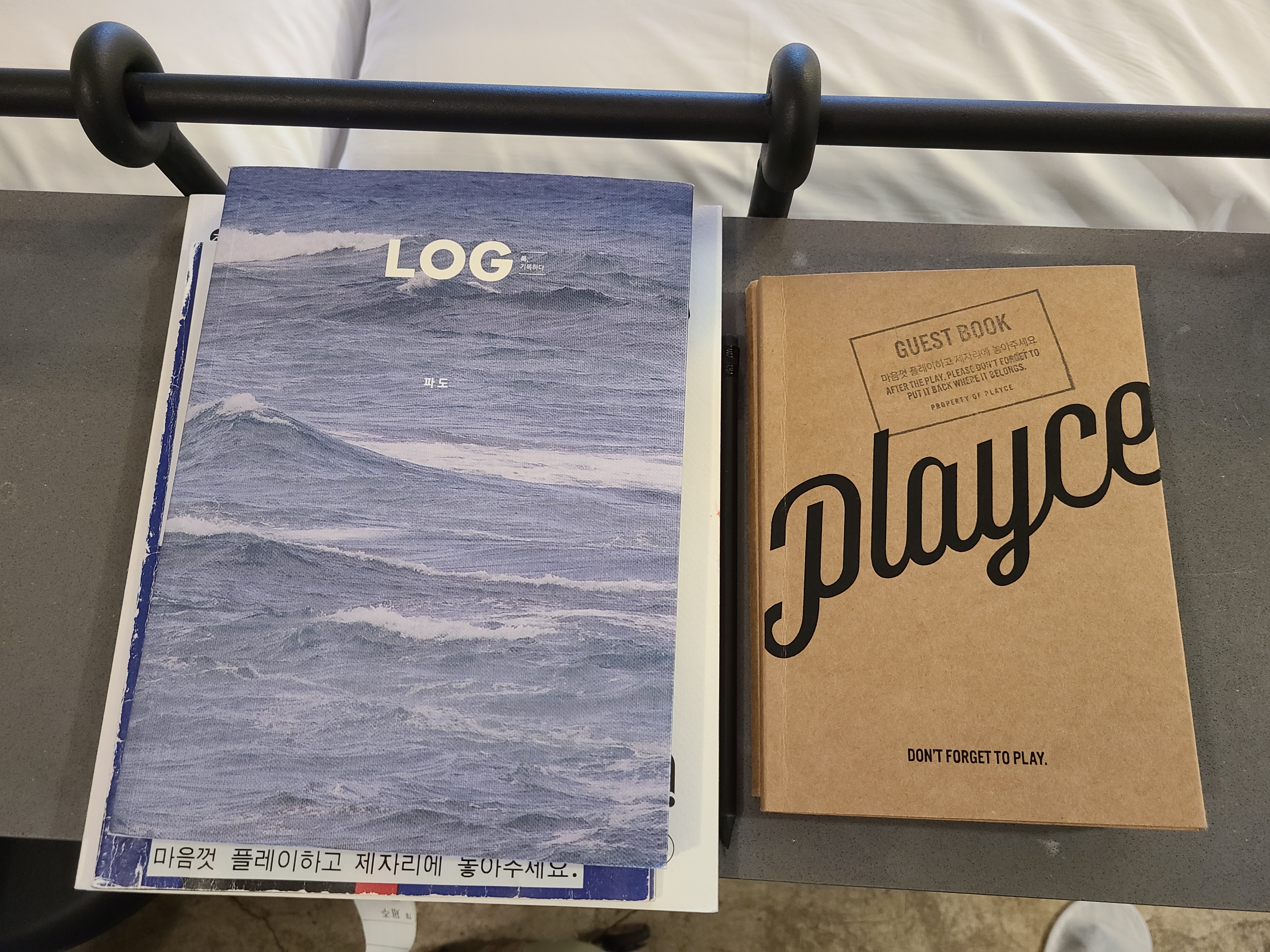 책상에는 심심할 때 읽을 수 있게 잡지가 있고, 방명록을 남길 수 있는 노트도 있었어요.